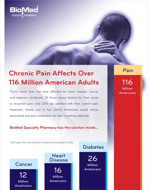 Bi-fold brochure design for BioMed Specialty Pharmacy, highlighting the dangers of opioid addiction and promoting compounding services.